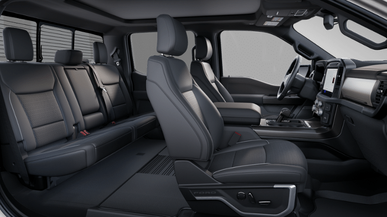 - Lariat Black Appearance Package: Black Grille; ActiveX Trimmed Bucket Seats; Black Exterior Badging; Gray Box Side Decal; Body-Color Front and Rear Bumpers; Body-Color Skull Caps and Door Handles; Black Taillamp Bezels; Matte Black Tailgate F-150 Decal; Dark Interior Appliques