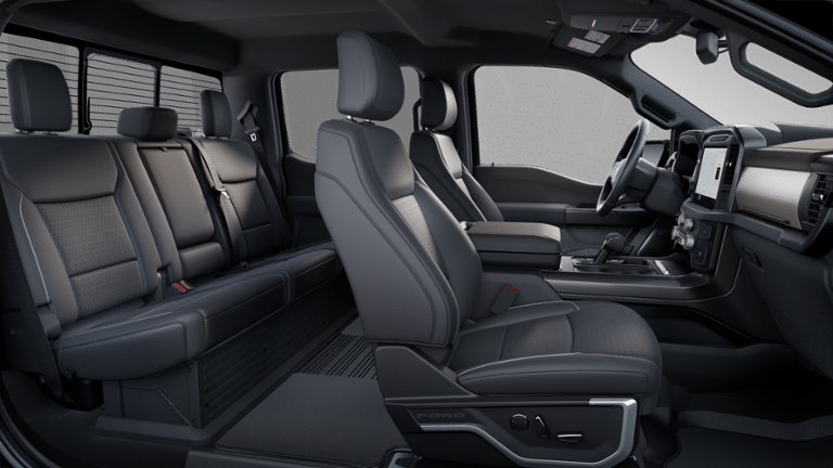 - Lariat Black Appearance Package: Black Grille; ActiveX Trimmed Bucket Seats; Black Exterior Badging; Gray Box Side Decal; Body-Color Front and Rear Bumpers; Body-Color Skull Caps and Door Handles; Black Taillamp Bezels; Matte Black Tailgate F-150 Decal; Dark Interior Appliques